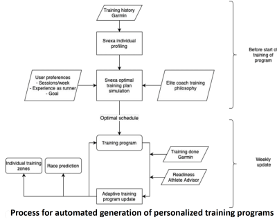 As seen in the flow chart, the initial 8-week training program for each runner was created by Ellida based on individual profiling, including objective measures (training log), subjective measures (fitness level, goals, and commitment), combined with domain expertise (philosophy by an world class coach). The first iteration of the training program was run through thousands of simulations, each with a slight tweak to the program, and the best simulated results, i.e. “Optimal schedule”, was provided to the runner. The training program is then continuously updated in a feedback loop with key metrics such as subjective ratings, compliance to the program, and training performance data.
